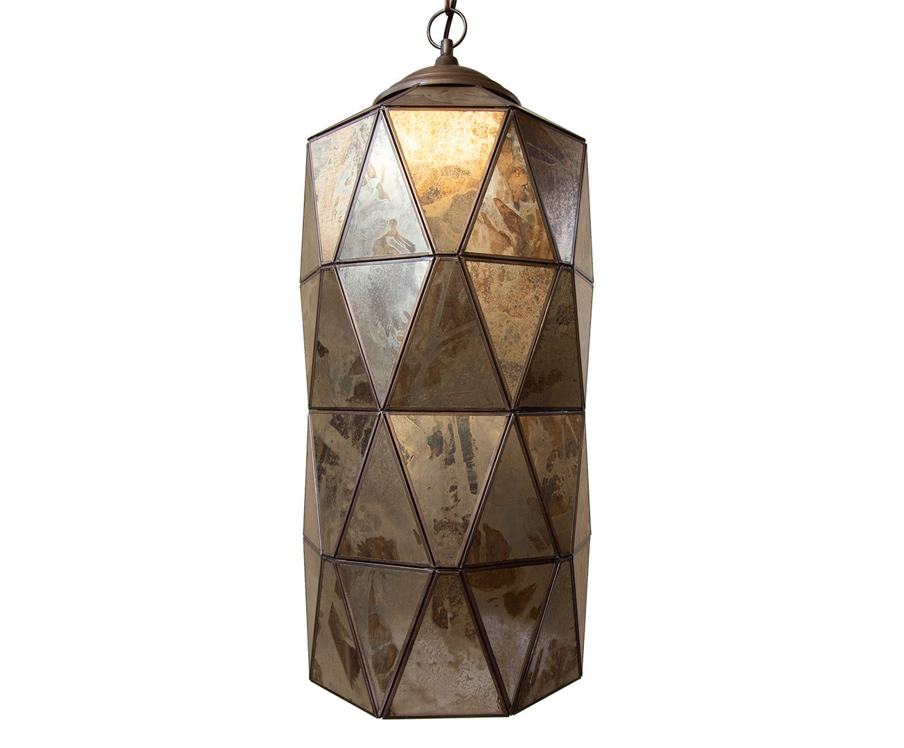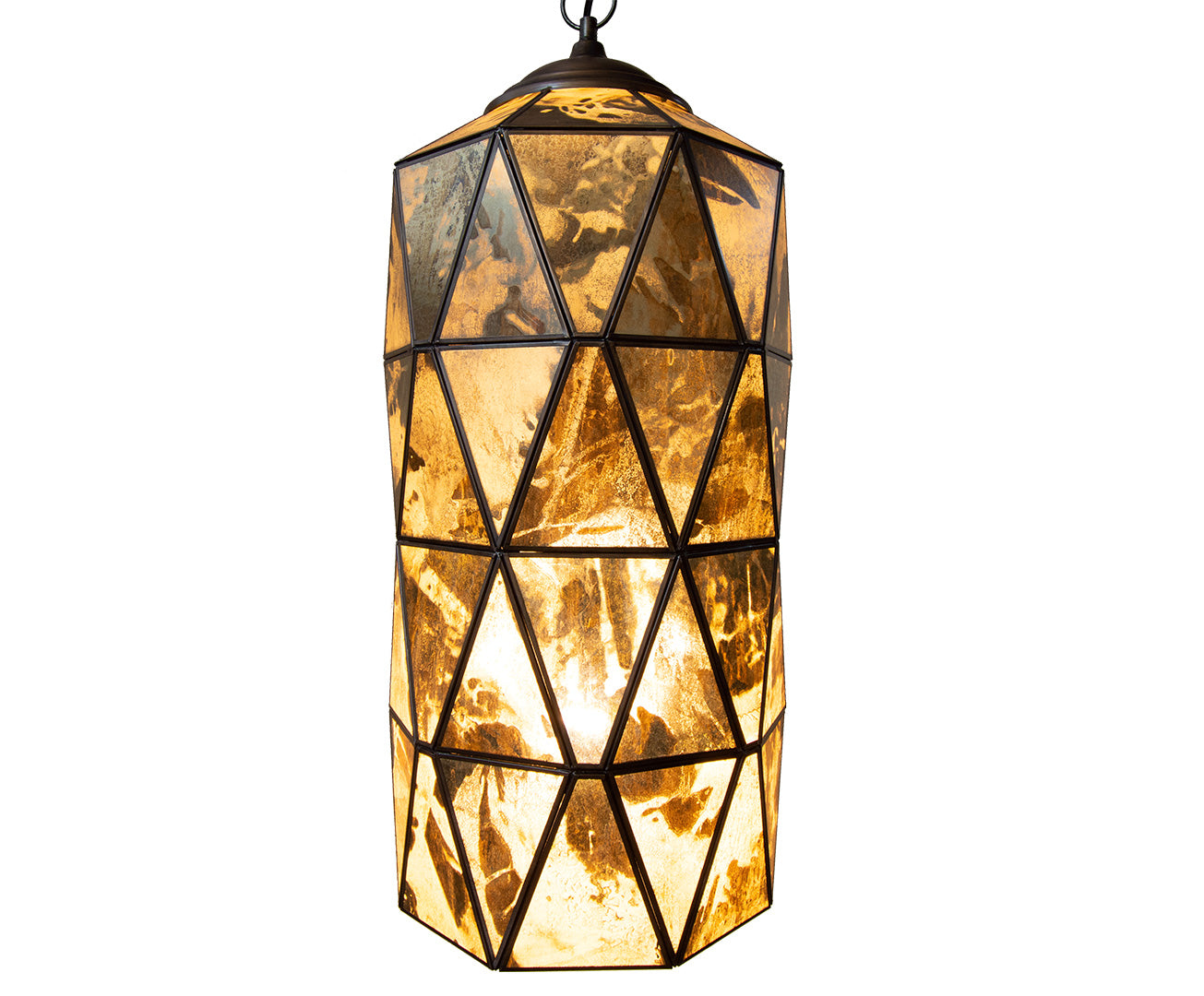 Ilumina tus espacios con una obra de arte y tradición. Esta exquisita lámpara colgante hecha a mano es creada por una familia de artesanos talentosos en el corazón de San Miguel de Allende, México. Su diseño presenta un impresionante marco de latón con patrón de diamantes, que alberga paneles de vidrio viejo en tonos ámbar, irradiando calidez y sofisticación.